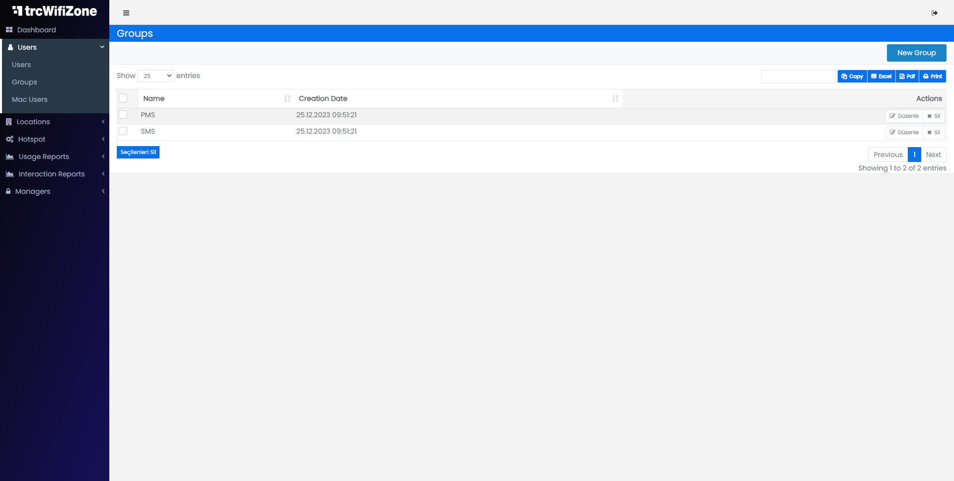 Groups sekmesinde, kullanıcılara atayabileceğiniz grupları görebilir ve oluşturabilirsiniz. Her gruba kendilerine has özellikler verebilirsiniz. Bu sayede kullanıcılara tek tek özellikler atamak yerine hazır özelliklere sahip gruba, bu kullanıcıyı alarak işlem sürenizi kısaltabilirsiniz.