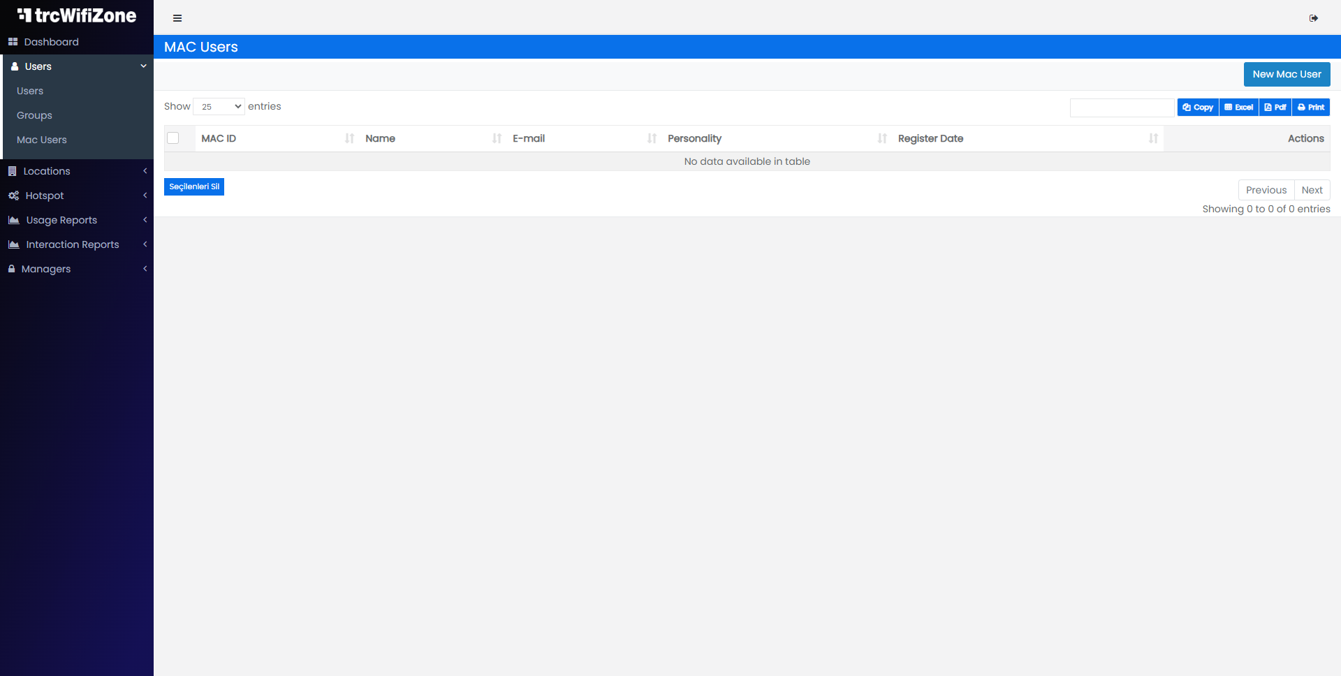 Mac Users sekmesinde, kullanıcıları MAC adresleriyle sisteme kayıt edebilir ve daha önce MAC adresi kullanılarak kayıt edilen kullanıcıları yönetebilirsiniz.