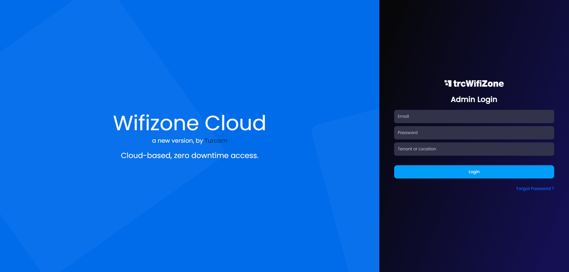 trcWifiCloud yönetim paneline erişebilmek için https://trcwificloud.com/admin/ adresine gitmelisiniz. Kullanıcı adı, şifre ve tenant bölümleri kayıt sırasında sizin belirlediğiniz değerlerdir. Doğru bilgileri girerek giriş yapınız.