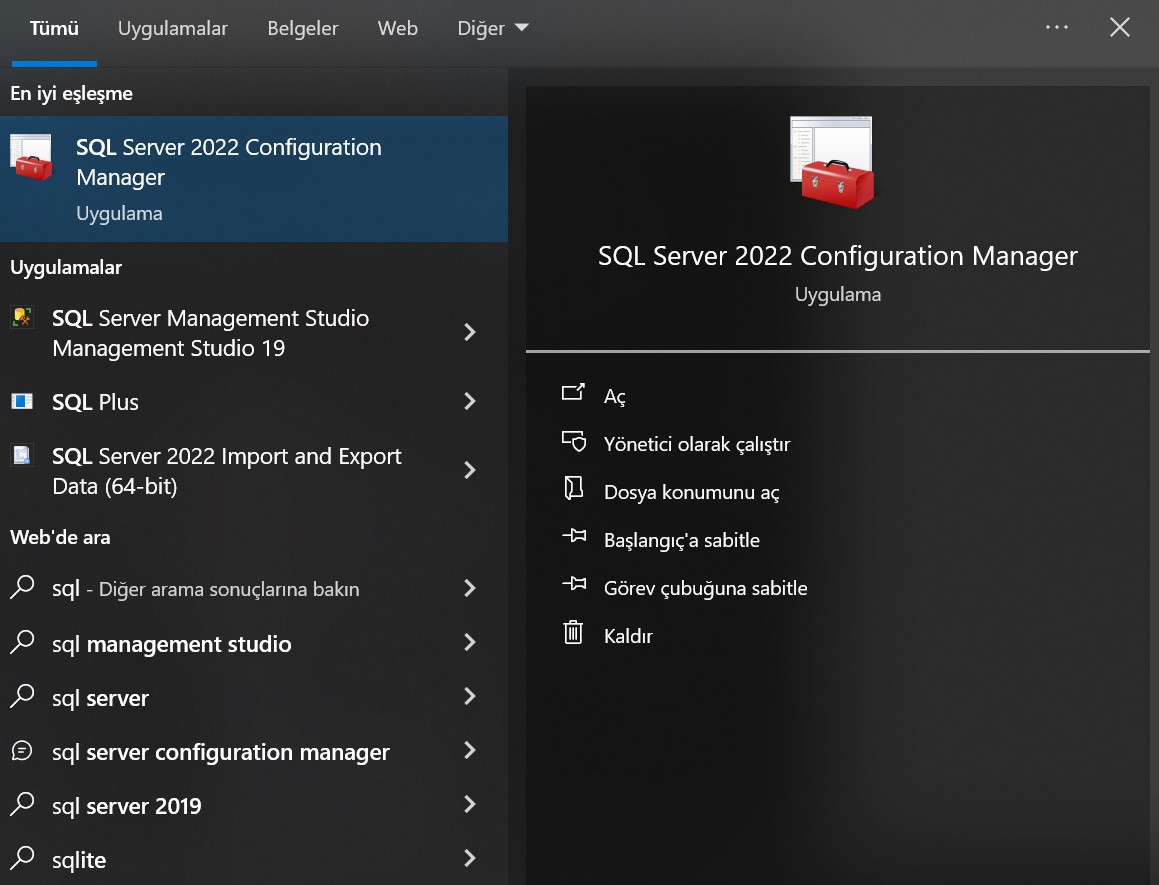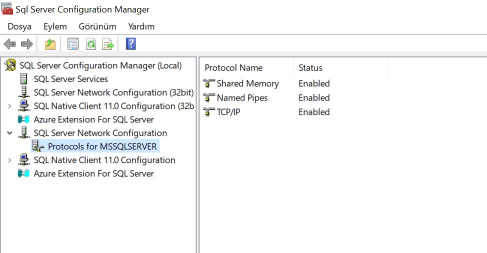 MSSQL Server üzerinde TCP/IP protokolünü aktif etmemiz gerekiyor. Bunun için SQL Server Configuration Manager hizmetini açmalısınız.