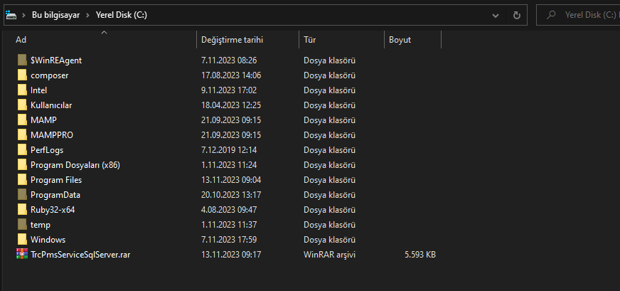 XXX adresine giderek “TrcPmsServiceSqlServer” isimli rar dosyasını indiriniz. Bu dosyayı indirdikten sonra kurulumu yapmak istediğiniz diskin içine rar dosyasını atın.