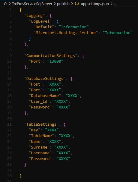 TrcPmsServiceSqlServer klasörünün içindeki “publish” klasörünün içerisinde bulunan “appsettings” dosyasını açın.