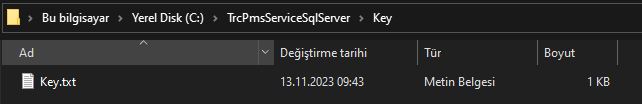 Bu komutlardan sonra TrcPmsServiceSqlServer klasörünün içerisine “Key” adında bir klasör oluşacaktır. Bu klasörün içerisinde bulunan “Key.txt” dosyasını açın ve sizin için oluşturulmuş anahtarın tamamını kopyalayın.