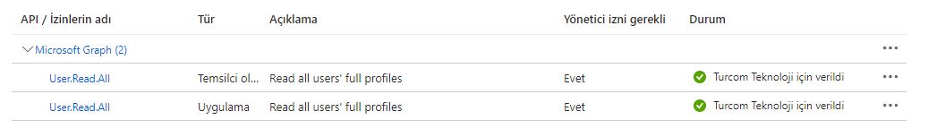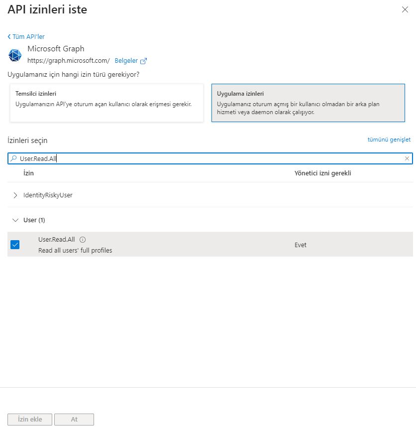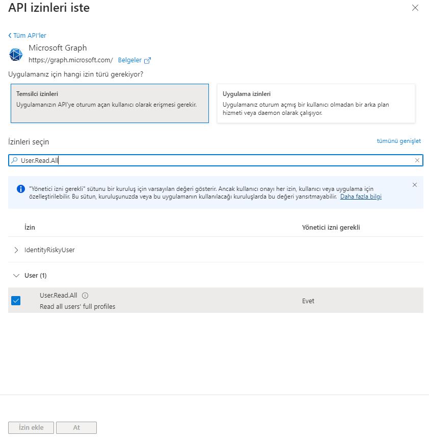 “Delegated Permissions” ve “Application Permissions” bölümlerinde bulunan “User.Read.All” izinlerini seçin ve ardından alt tarafta bulunan “Add permissions” butonuna tıklayın.