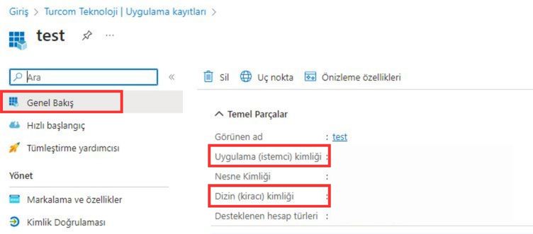 Kayıt oluşturulduktan sonra açılan ekranın sol tarafındaki menüde bulunan “Overview” (Genel Bakış) sekmesine tıklayın. Üst tarafta bulunan “Application (client) ID” (Uygulama (istemci) kimliği) olarak görünen ve “Directory (tenant) ID” (Dizin (kiracı) kimliği) olarak görünen değerleri kopyalayın.