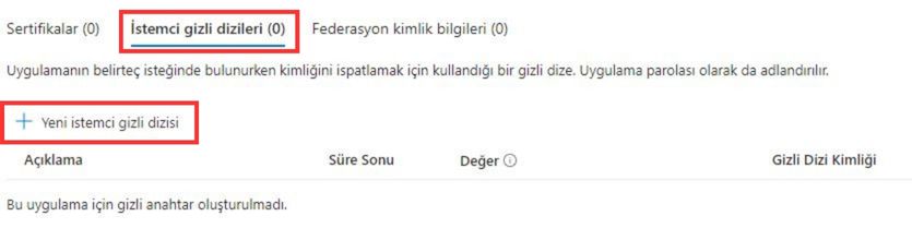 Çıkan ekranda “Client secrets” (İstemci gizli dizileri) bölümüne gidin ve “New client secret” (Yeni istemci gizli dizisi) butonuna tıklayın.