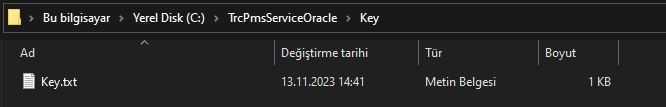 Bu komutlardan sonra TrcPmsServiceOracle klasörünün içerisine “Key” adında bir klasör oluşacaktır. Bu klasörün içerisinde bulunan “Key.txt” dosyasını açın ve sizin için oluşturulmuş anahtarın tamamını kopyalayın.