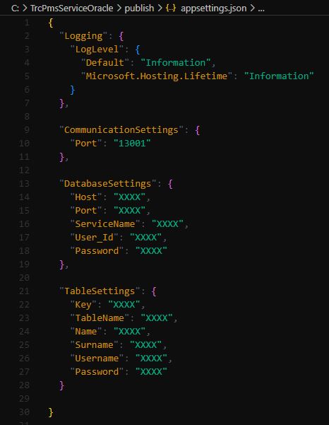 TrcPmsServiceOracle klasörünün içindeki “publish” klasörünün içerisinde bulunan “appsettings” dosyasını açın.