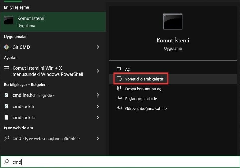 Windows’un başlat tuşuna basarak veya alt kısımda bulunan arama butonuna tıklayarak açılan pencereye “CMD” veya “Komut İstemi” yazın. Sağ tarafta bulunan “Yönetici olarak çalıştır” butonuna tıklayın. Yönetici olarak çalıştırabilmeniz için açılan pencerede “Evet” butonuna tıklamalısınız.